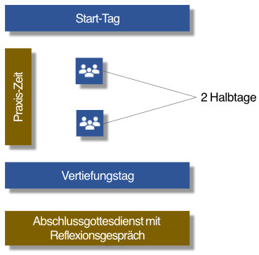 Das Zusatzmodul umfasst zwei Studientage, ein individuelles Coaching (Praxis-Zeit), zwei Halbtage in Kleingruppen und einen Abschlussgottesdienst mit Reflexionsgespräch.